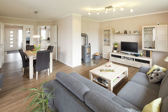 Traditionelle Form mit dem besonderen Etwas. Eine Wohnebene für die ganze Familie. Bodentiefe Fenster zur Terrasse lassen viel Licht herein.